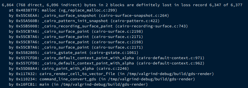 ==5437== 92,738,440 (3,456 direct, 92,734,984 indirect) bytes in 9 blocks are definitely lost in loss record 6,396 of 6,399 ==5437== at 0x483877F: malloc (vg_replace_malloc.c:299) ==5437== by 0x52E5AAA: ??? (in /usr/lib/libcairo.so.2.11600.0) ==5437== by 0x52C16EB: ??? (in /usr/lib/libcairo.so.2.11600.0) ==5437== by 0x52D19FE: ??? (in /usr/lib/libcairo.so.2.11600.0) ==5437== by 0x52EA576: ??? (in /usr/lib/libcairo.so.2.11600.0) ==5437== by 0x52EA576: ??? (in /usr/lib/libcairo.so.2.11600.0) ==5437== by 0x529EFFB: ??? (in /usr/lib/libcairo.so.2.11600.0) ==5437== by 0x529938F: ??? (in /usr/lib/libcairo.so.2.11600.0) ==5437== by 0x52F7204: cairo_paint_with_alpha (in /usr/lib/libcairo.so.2.11600.0) ==5437== by 0x116EA2: cairo_render_cell_to_vector_file (cairo-output.c:281) ==5437== by 0x110280: command_line_convert_gds (command-line.c:170) ==5437== by 0x10FCF7: main (main.c:314)...