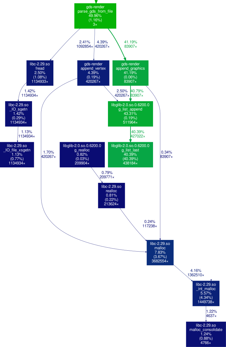 The parse_gds_from_file() functions needs about 50% execution time in the conducted testrun. The majority of this time is needed in g_list_append's internally used function g_list_last.